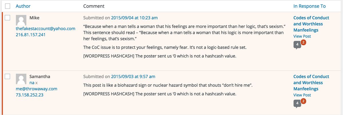 OK here it is: catehuston.com/blog/2015/09/02/code-of-conducts-and-worthless-manfeelings/ No worthless manfeelings please. My capacity has been exceeded. Forever.