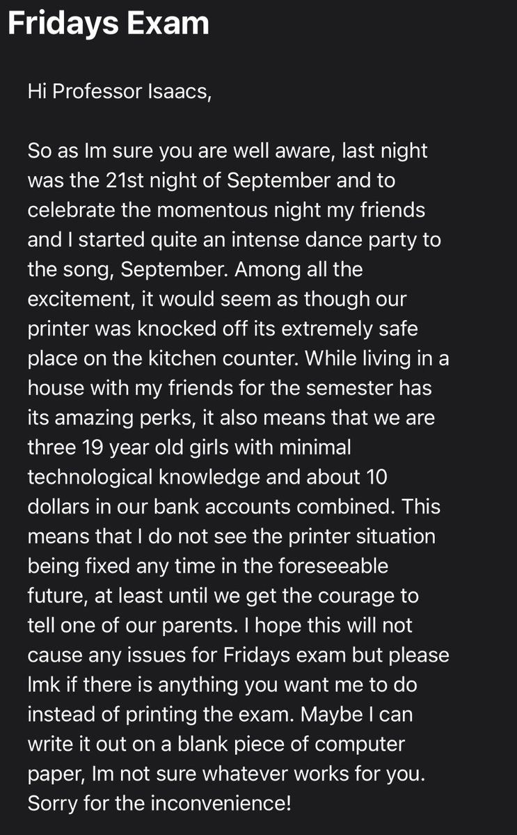 RT drdre4000: This email from a student, when I taught remote, lives rent free in my head 😂